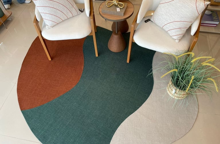 Agende sua visita à nossa fábrica de tapetes sob medida e descubra nossos designs sofisticados em formatos orgânicos e estampas geométricas.